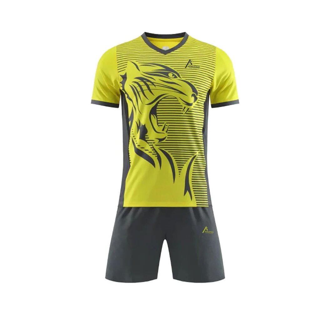 A football uniform typically includes a lightweight, breathable jersey with a team logo and player number for identification. It is paired with matching shorts and socks that reach the shin, often with stripes or patterns. Cleats with studs provide traction on the field, and shin guards are worn underneath for protection. The design features vibrant team colors and may include a captain’s armband. The fabric is designed to wick sweat, ensuring comfort during intense play.
